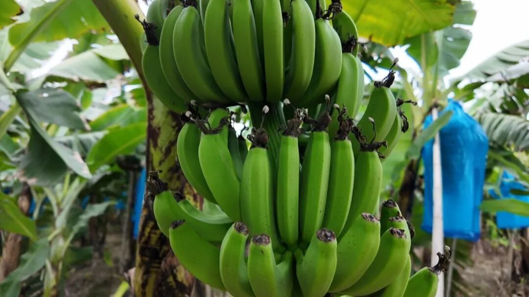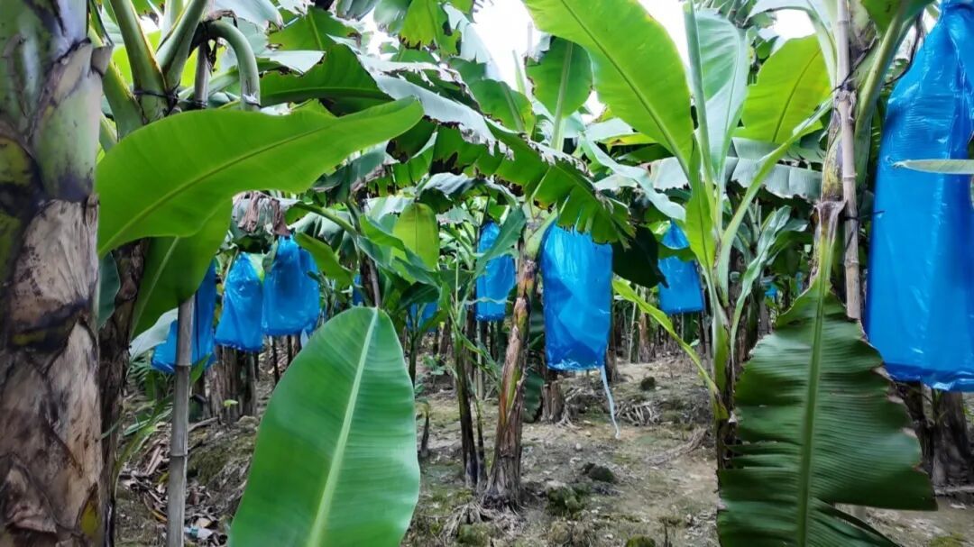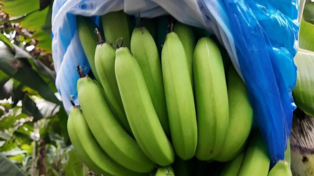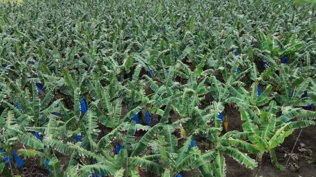 日头刚爬过蕉林顶,大诚村的巴西蕉基地里洋溢着清新的蕉香与劳作的活力。层层叠叠的蕉叶在田间织就一片浓荫,蓝塑料袋裹着的果串沉甸甸坠在蕉秆上,透露着沉甸甸的丰收分量。